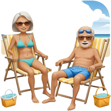 an emoji that shows elderly one slim woman in bikini and one man with dickbauch in bath shorts, both are retired and are lying in sun-chairs at the beach to recover from retiring-stress emoji