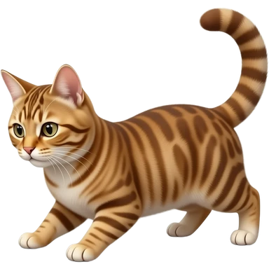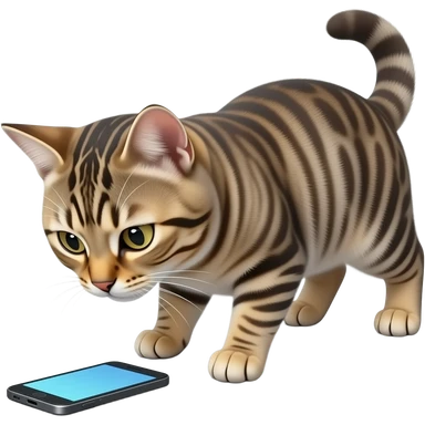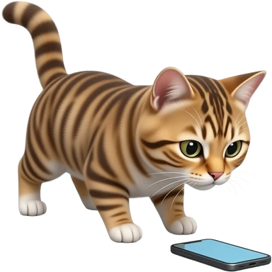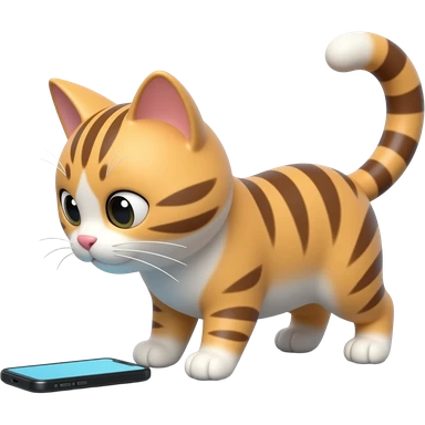 Glossy 3D rendered realistic cat emoji on all fours, detailed fur and features, side profile, looking at a smartphone on the ground in front of it, slightly rounded edges, soft shading, white background emoji