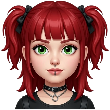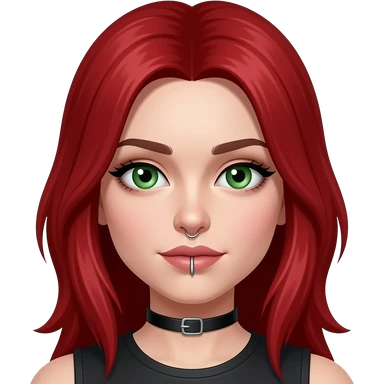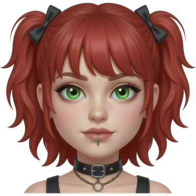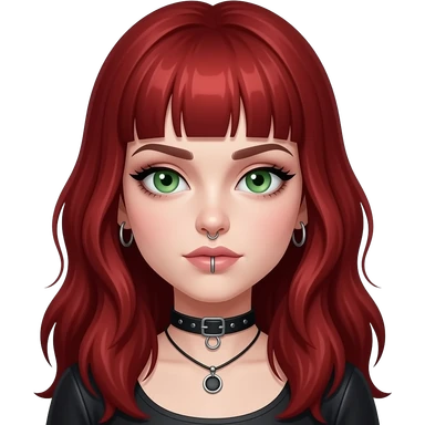 redhead goth girl with green eyes, vertical labret and nose piercing, with hair down emoji