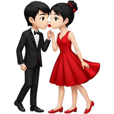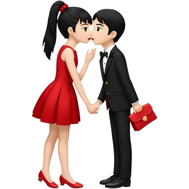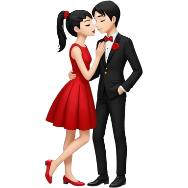 Make a girl has 18 years old black ponytail red dress, red flat and a boy has 19 years old black hair black tuxedo black shoes boy and girl kiss emoji