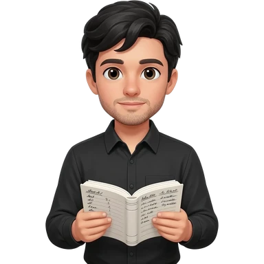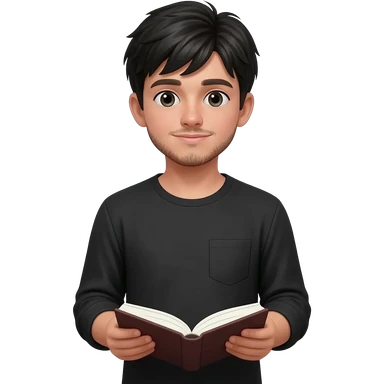 create emoji of boy with fair skin, middle parted hair black, some facial hair, wearing a full sleeved black shirt and holding an book with accounts written on it emoji