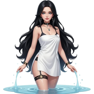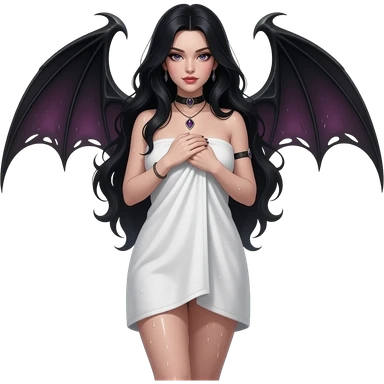 Sexy gothic black haired woman in towel and wet. Full body. Fantasy and seductive emoji