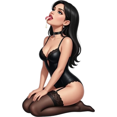 Sexy gothic woman in black lingerie sitting on her knees with her head tilted up and her tongue out with cream droplet dropping onto her tongue from above her emoji