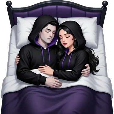 Sexy gothic couple laying down in bed and cuddling with their eyes closed wearing black and purple hoodies. . Realistic emoji
