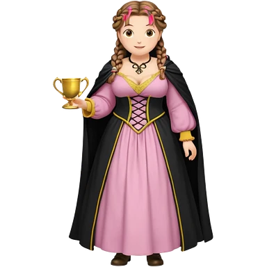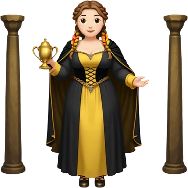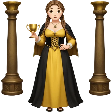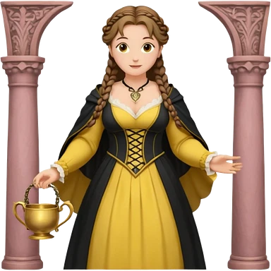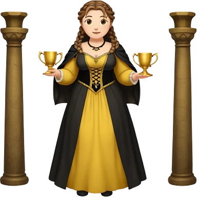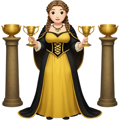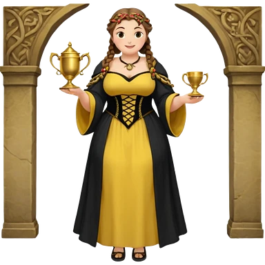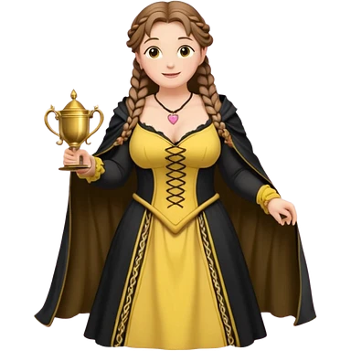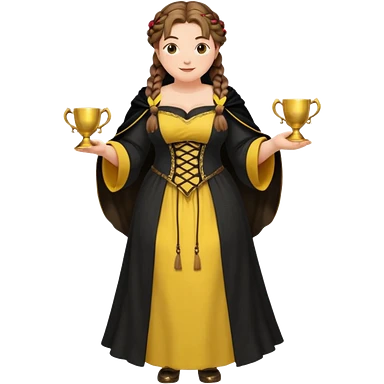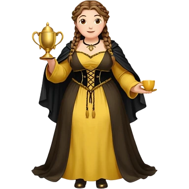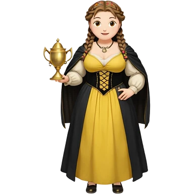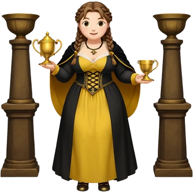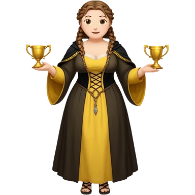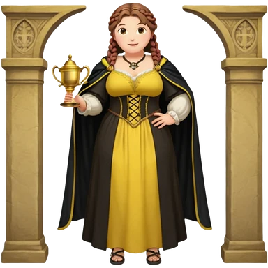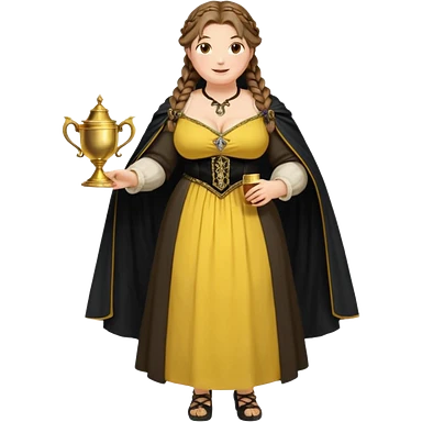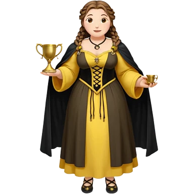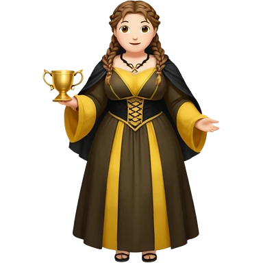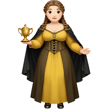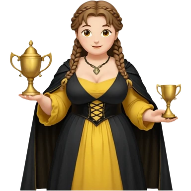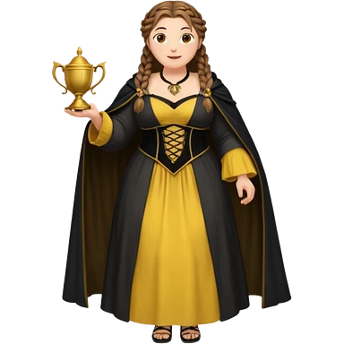 Helga Hufflepuff,brown-haired,2 braids,yellow-black medieval open dress,deep neckline,fat macromastia,black cloak decorated with gold braiding,gold cup with two handles,very kind smile,curvy busty sweet woman,round rosy cheeks,full length with medieval shoes emoji