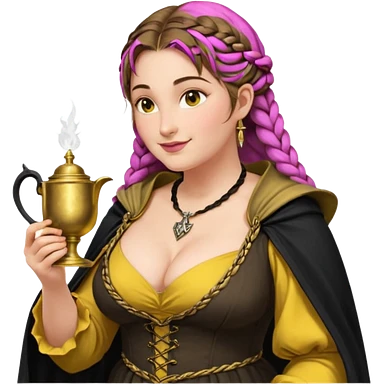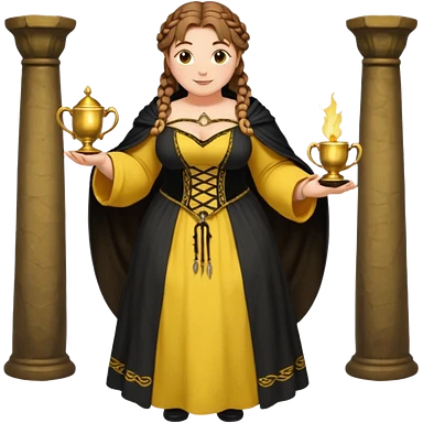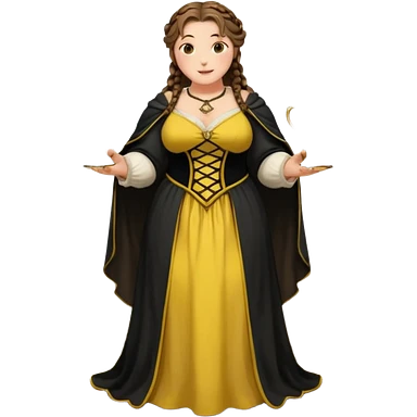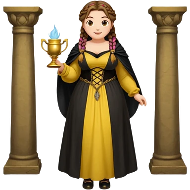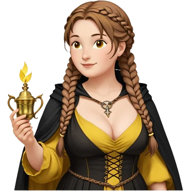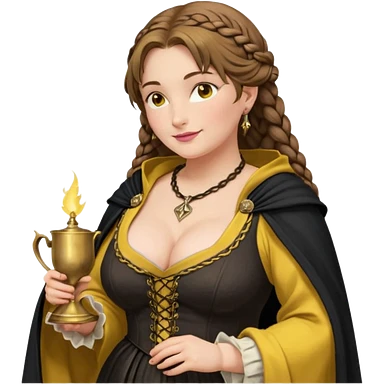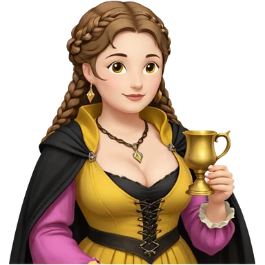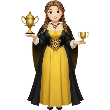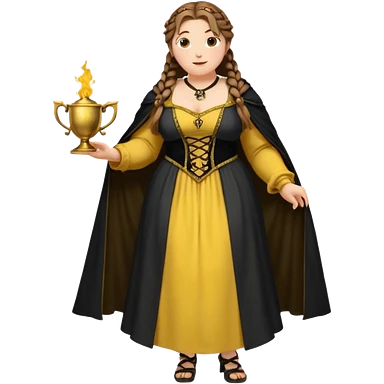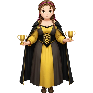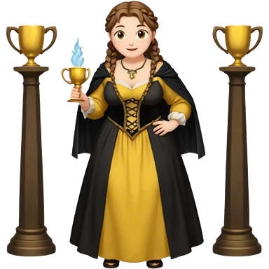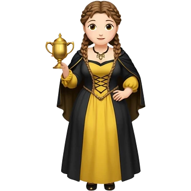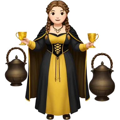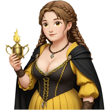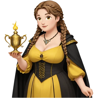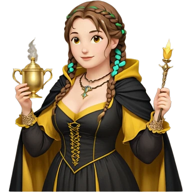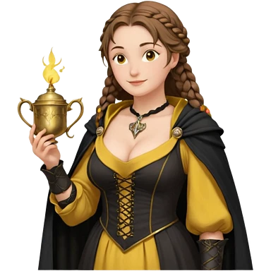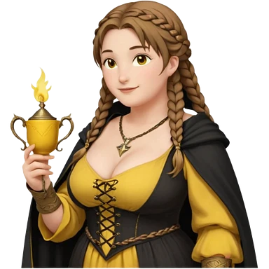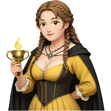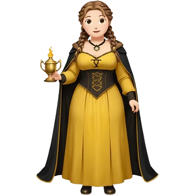 Helga Hufflepuff,the Hogwarts founder of Hufflepuff,brown-haired,2braids,yellow-black medieval dress with black cloak decorated with gold braiding,flickering magic wand and tiny two-handled shiny gold cup engraved with the badger silhouette,very kind smile,curvy busty sweet emoji