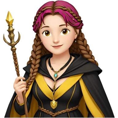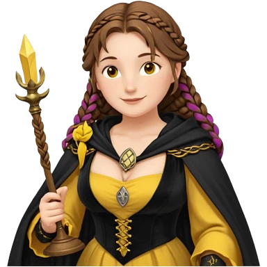 Helga Hufflepuff, brown-haired, 2 long brown braids, yellow-black medieval dress, deep neckline, black cloak decorated with gold braiding, small magic wand made of wood, tiny two-handled shiny yellow-gold cup, very kind smile, curvy busty sweet woman, macromastia, thick round rosy cheeks emoji