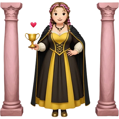 Helga Hufflepuff,brown-haired,2 braids,yellow-black medieval open dress,deep neckline,fat macromastia,black cloak decorated with gold braiding,gold cup with two handles,very kind smile,curvy busty,round rosy cheeks,full length with medieval shoes, inscription in pink heart says:"I love HELGA" emoji
