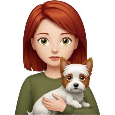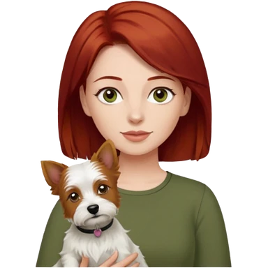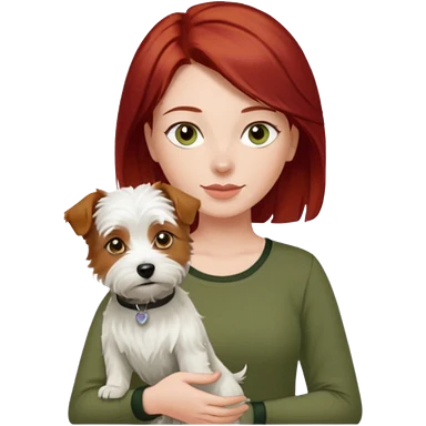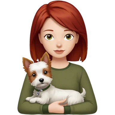 white terrier dog being held by woman with dark red long hair and hazel eye wearing olive green top emoji