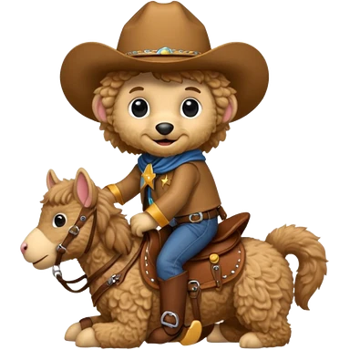 Mini golden doodle wearing a saddle with a finger monkey on its back wearing a cowboy costume emoji