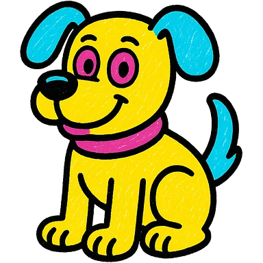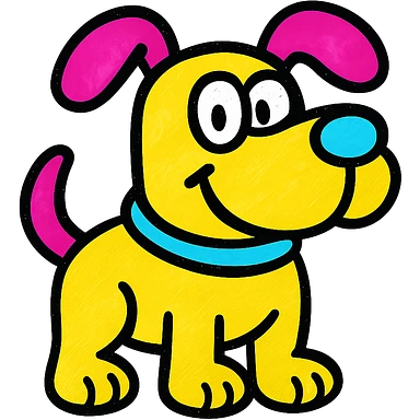 cartoon dog with head tilted, barking 'Woef Woef', bright and bold pop colors style emoji