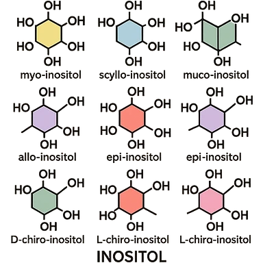 scientific infographic of inositol molecule at center surrounded by 9 isomeric forms: myo-inositol, scyllo-inositol, muco-inositol, neo-inositol, allo-inositol, epi-inositol, cis-inositol, D-chiro-inositol, L-chiro-inositol; each isomer labeled with its name; stylized molecular structures; pastel colors; white background; clean and didactic style emoji