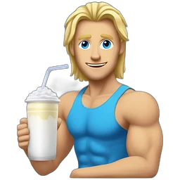 Man with shoulder length blonde hair and blue eyes with muscles sitting in front of computer and a protein shake emoji