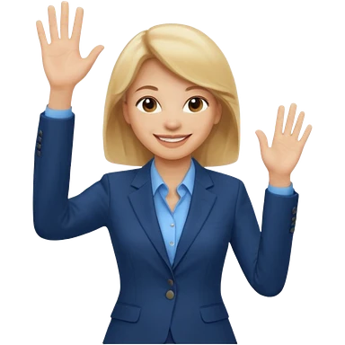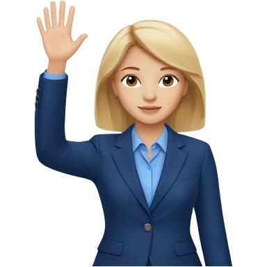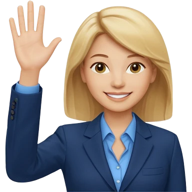 Make emoji of business woman with light skin and medium blonde hair in a dark blue business suit and light blue shirt waiving to new clients emoji