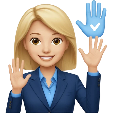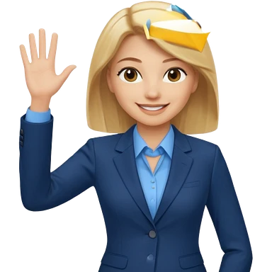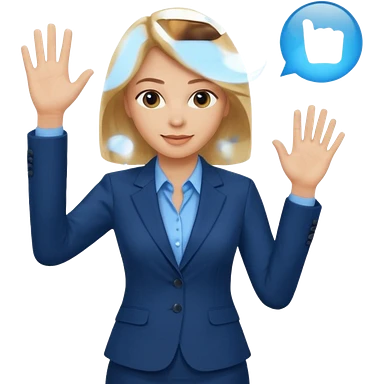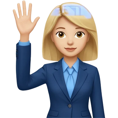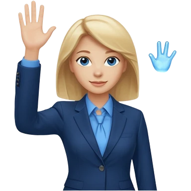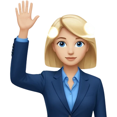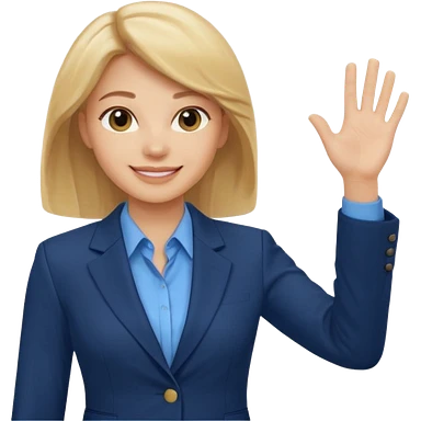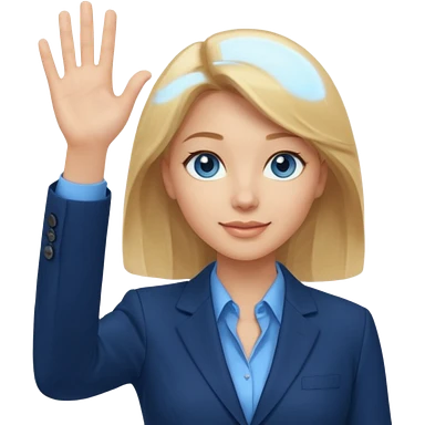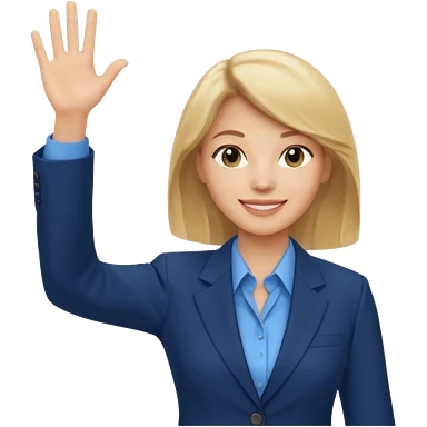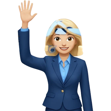 Make emoji of business woman with light skin and medium blonde hair in a dark blue business suit and light blue shirt waiving to new clients. Woman should have sparkling blue eyes. emoji