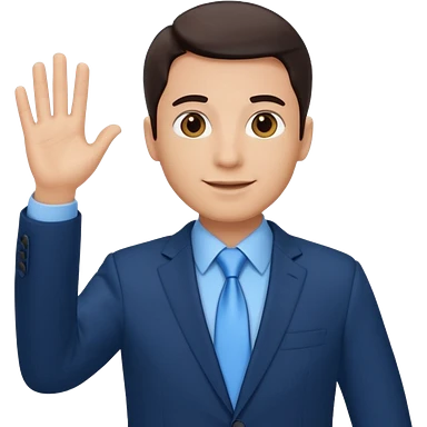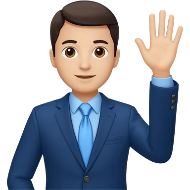 Make emoji of me in a dark blue business suit and light blue shirt waiving to new clients emoji