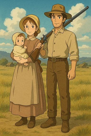 The full bodies of a young husband and wife who are pioneer settlers in the American West in the 1850s. The wife has a young child and the husband is carrying a rifle. emoji