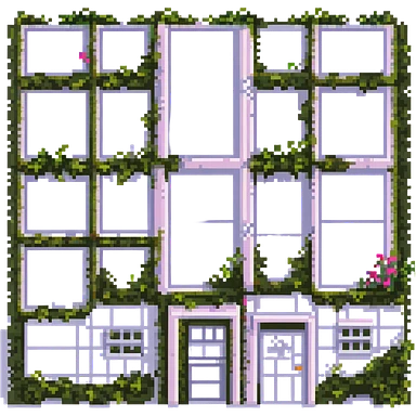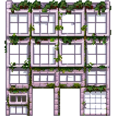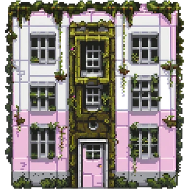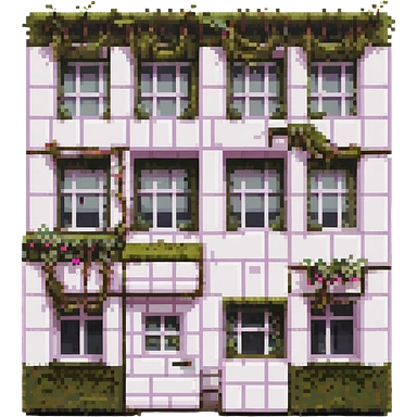 Сделай русскую панельку белого цвета. Она должна быть в виде куба, а также с окнами 3 на 3 на каждом фасаде. Панелька заросла лозой и мхом, некоторые окна розовые. Панелька должна быть в форме куба. emoji