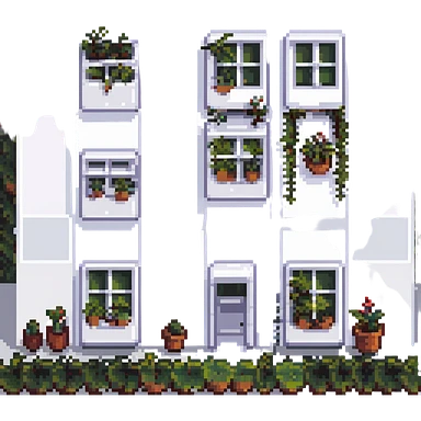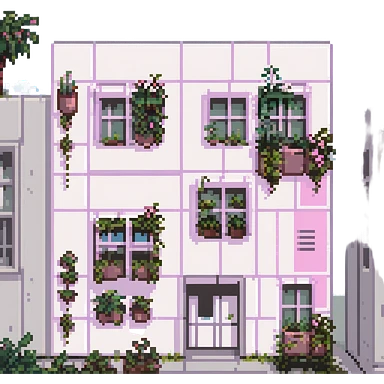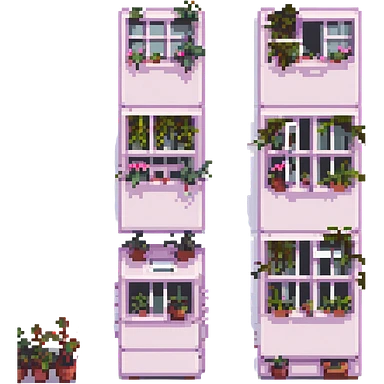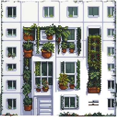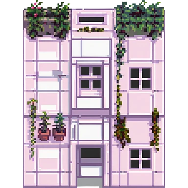 Сделай русскую панельку белого цвета. Она должна быть в виде куба, а также с окнами 3 на 3 на каждом фасаде. Панелька заросла растениями, некоторые окна розовые emoji