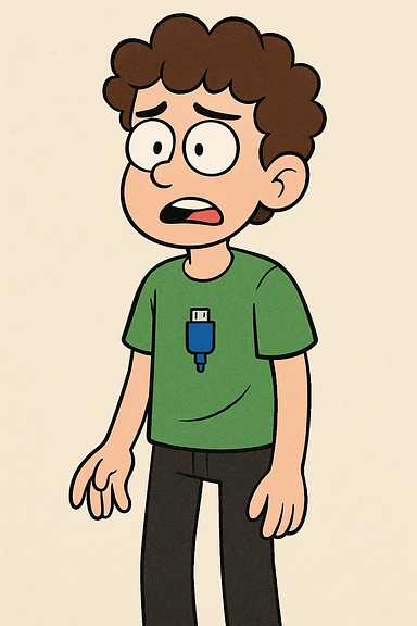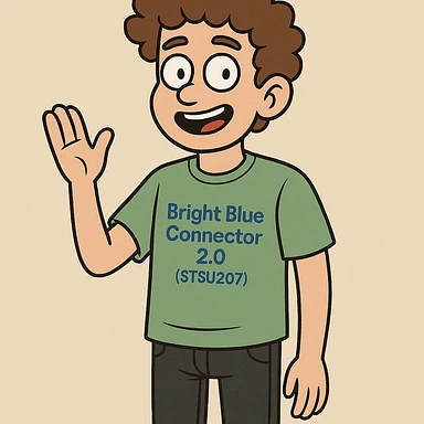 A boy brown curly hair green t-shirt Bright Blue Connector 2.0 (STSU207) black jeans emoji