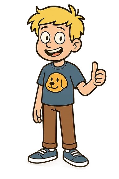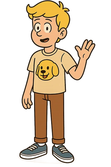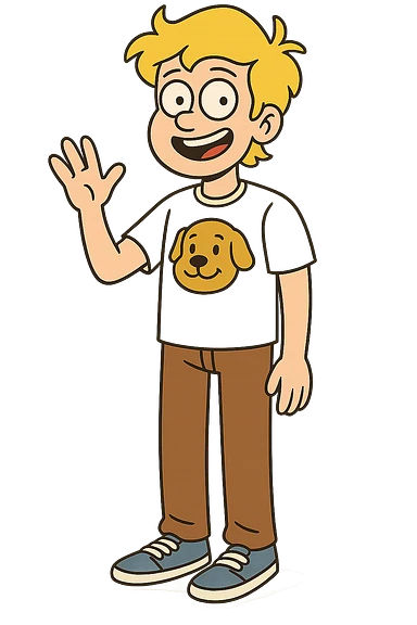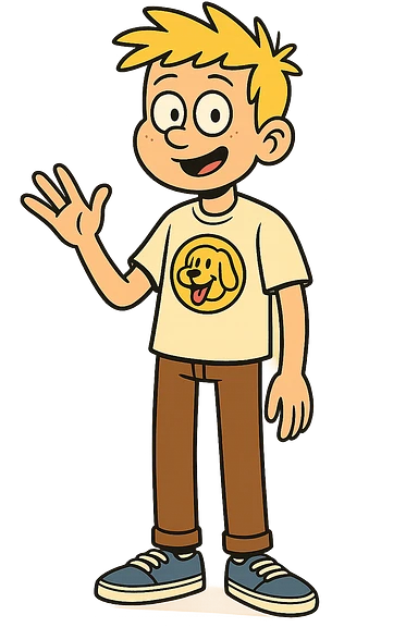 A boy yellow hair dog mascot logo t-shirts brown trousers blue vans shoe emoji