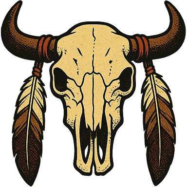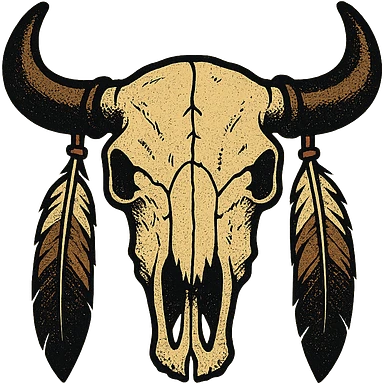 A native American buffalo skull with feathers hanging from both horns. Make the skull symmetrical facing the front emoji