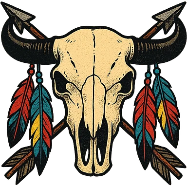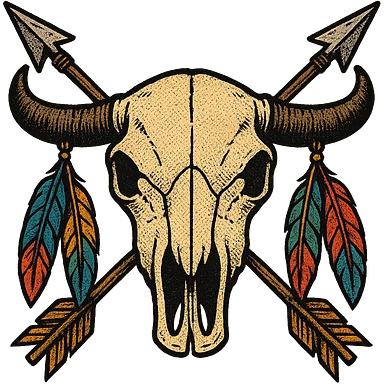 A native American buffalo skull with colourful feathers hanging from both horns and two crossed arrows in the background. Make the skull symmetrical facing the front emoji