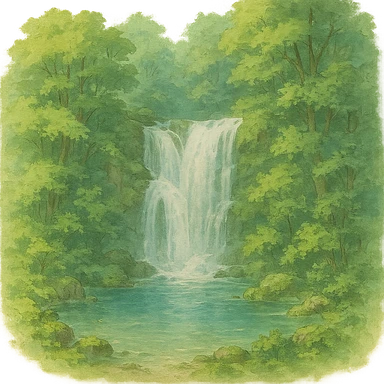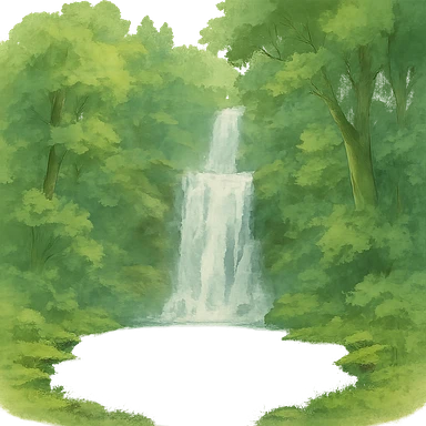 waterfall then lake and the rest of the waterfall in forest, natural colors, soft, fairy-like atmosphere, no background, square size emoji