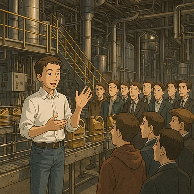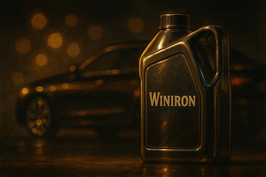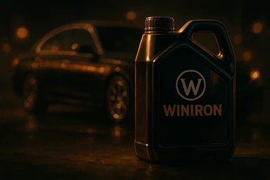 a premium dark moody automotive scene. A Winiron motor oil container stands in the foreground, illuminated by soft golden rim light. Background is a luxury car silhouette with warm reflections, blurred bokeh lights, and deep shadows. Add subtle metallic shine, glossy highlights on the container. Composition should feel cinematic, expensive, and powerful. No text, no distortions, keep the Winiron logo original.illustration