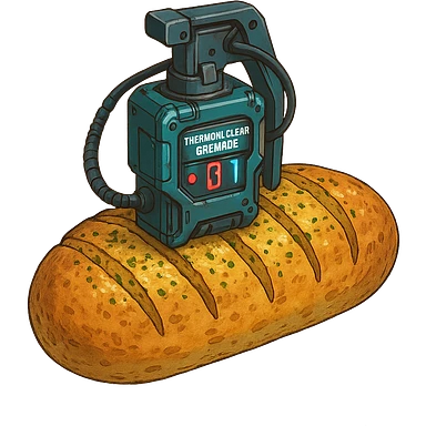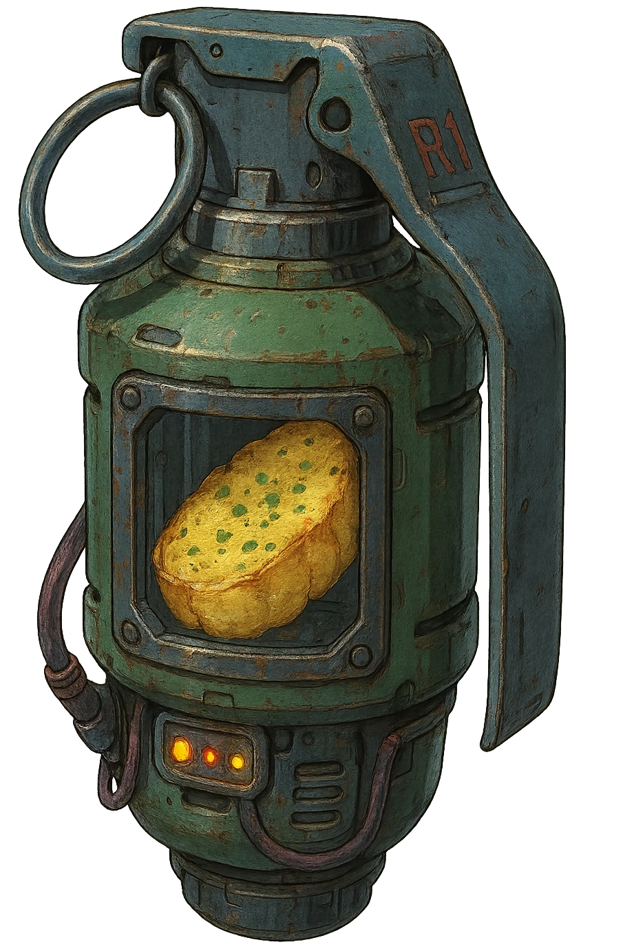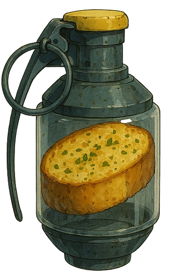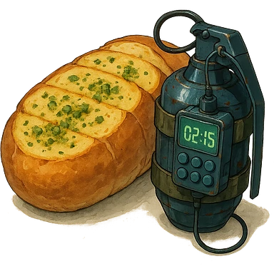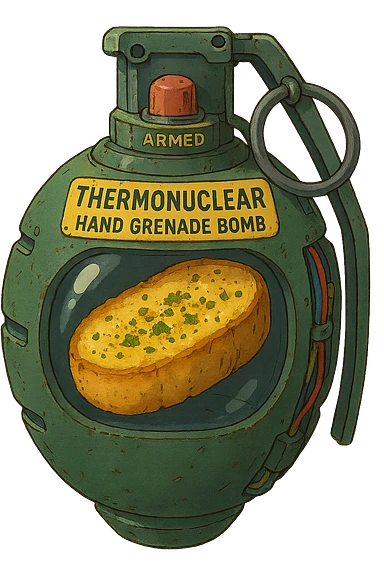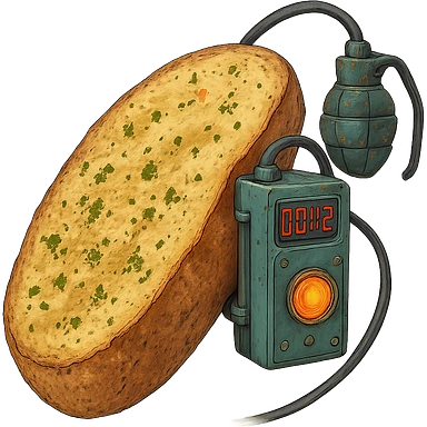 a thermonuclear hand held grenade IED, futuristic cyberpunk. The primed exlosive element is not c4 plastique, but it is garlic bread. illustration | AI Emoji Generator