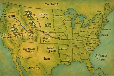 A topographical map of the USA in the 1840s which labels the rocky mountains, orgegon, california, Salt Lake City illustration | AI Emoji Generator