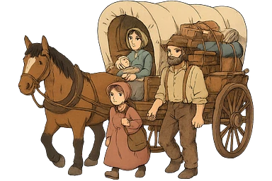 A poor American pioneer family in the 1840s setting out with a horse and wagon stuffed with their belongings to migrate to the American West. emoji