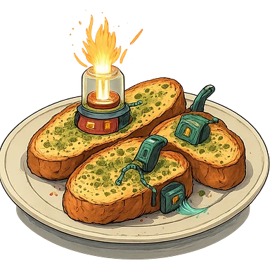 a plate of thermonuclear futuristic cyberpunk garlic bread, flawless, perfect, masterwork. highly dangerous emoji