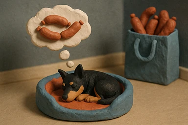 A small black and tan terrier dog curled up inside a fleece dog bed. the dog is dreaming about sausages. the room in the background is mainly coloured grey with a shopping bag in the background filled with lots of sausages emoji