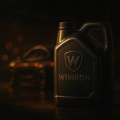 a premium dark moody automotive scene. A Winiron motor oil container stands in the foreground, illuminated by soft golden rim light. Background is a luxury car silhouette with warm reflections, blurred bokeh lights, and deep shadows. Add subtle metallic shine, glossy highlights on the container. Composition should feel cinematic, expensive, and powerful. No text, no distortions, keep the Winiron logo original. emoji