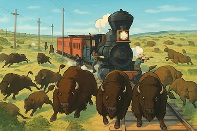 A native American warrior with a bow and arrow on horseback hunting a buffalo on the great plains grassland with other native americans in the background emoji