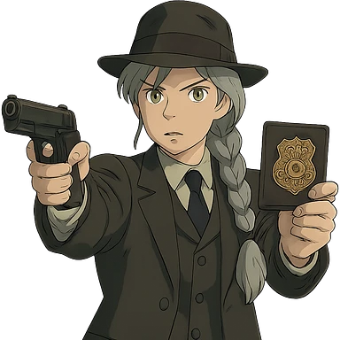 1 female, 1920's mens suit, long white hair braid, gold yellow eyes, muted dark colors, brandishing a colt 1911 and a detective badge emoji