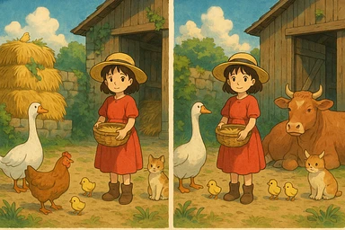 Make me a spot the difference image with 5 differences. The theme is a farmyard emoji