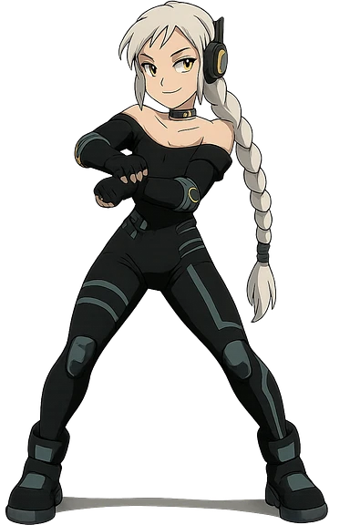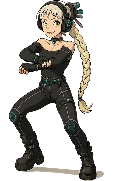 1 female, gold yellow eyes, long white braid, black off shoulder top, futurepunk cybergoth doing “oppa gangnam style” dance emoji