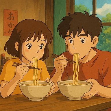 beige bunny happily slurping noodles in soft Ghibli style emoji