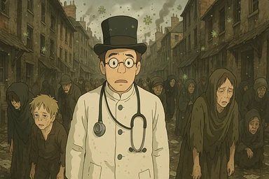 An early victorian slum area of London in the 1800s which is overpopulated, dirty and lots of waste on the floor. There are ill looking people with germs in the air. In the foreground is a confused looking doctor emoji