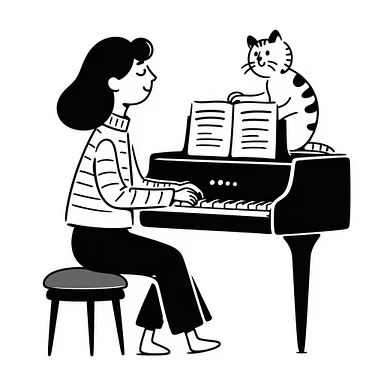 woman playing piano while her cat sits on top of the piano emoji