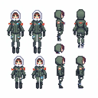 1 female, a vtuber in a cryo suit with a flight jacket, walk run jump anim sprite sheet emoji