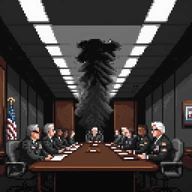 a SNES box art image of PENTAGON officials in a dark smoke filled board room meeting. cutscene graphic - 3/4 side perspective emoji