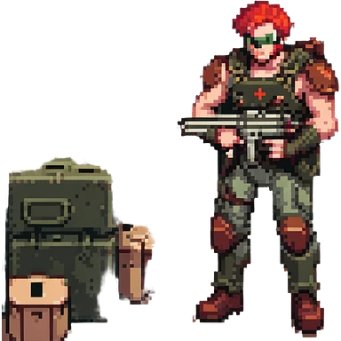a SNES box art image of a man in military gear disarming a IED inside of a toolshed, dramatic single overhead lamp, he has red hair and a face like retro doomguy emoji