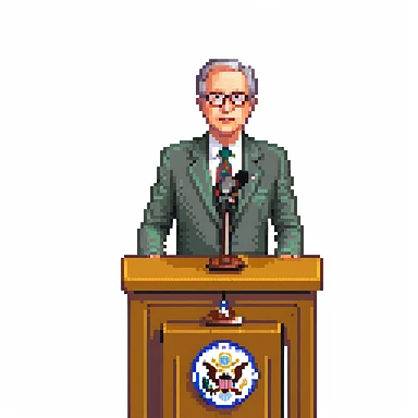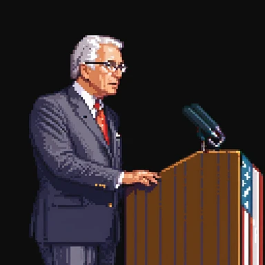 a SNES box art image of a man who looks like a fiftysomething distinguished american politician, standing and speaking emphatically at a podeum. cutscene graphic - 3/4 side perspective emoji