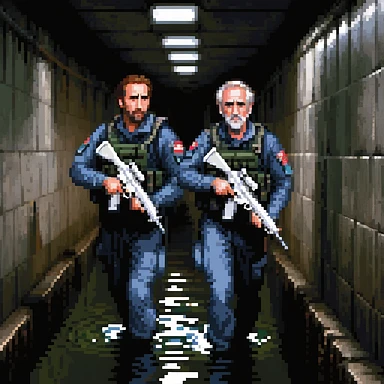 a SNES box art image of navy seals nicholas cage and sean cohnery sneaking through a dark sewer holding 2 mp5's, blue and orange color schemecutscene graphic - 3/4 side perspective emoji