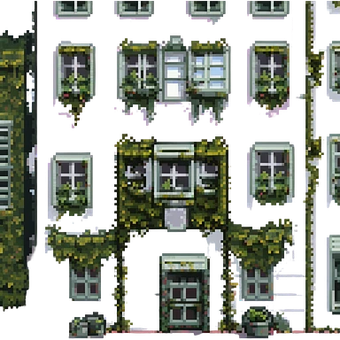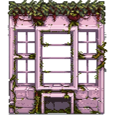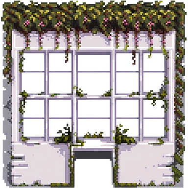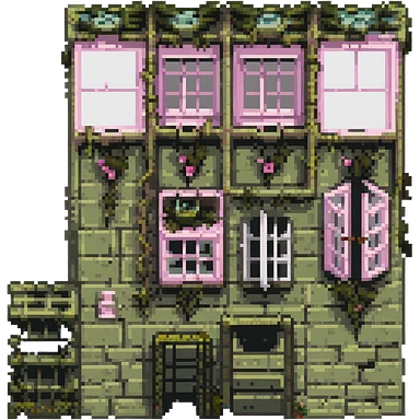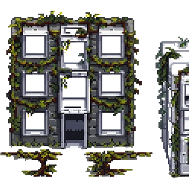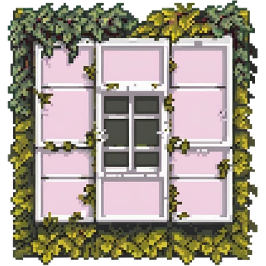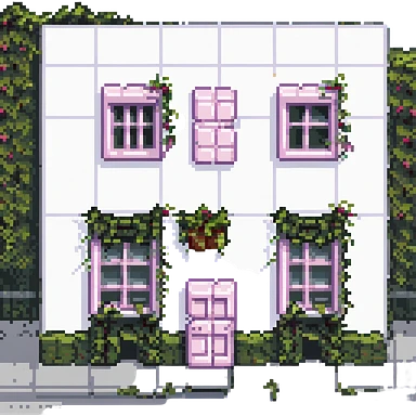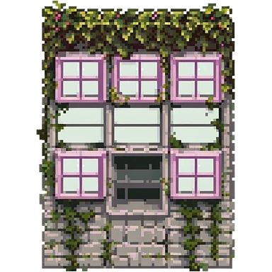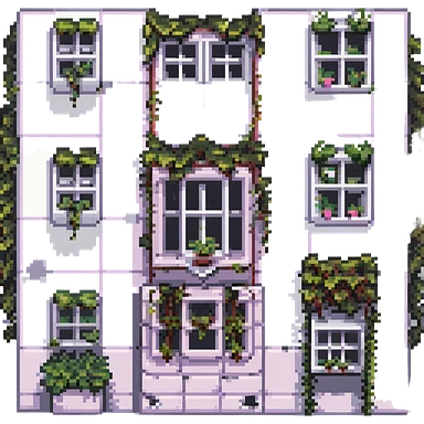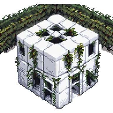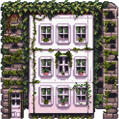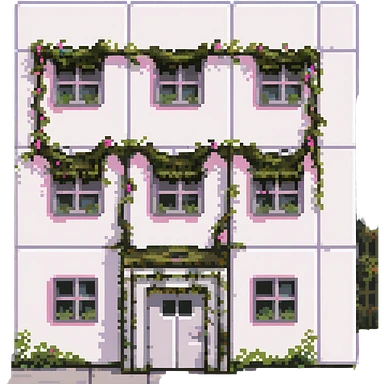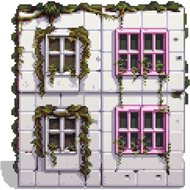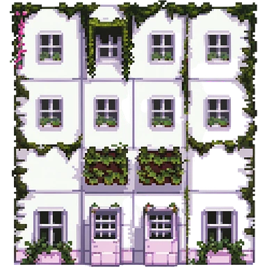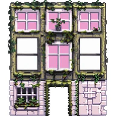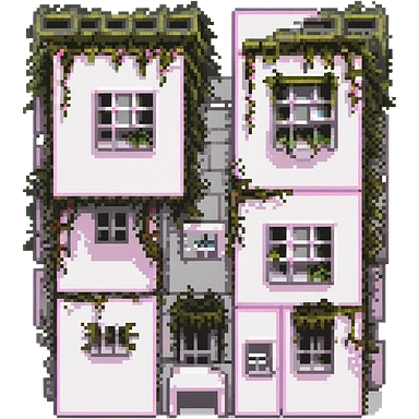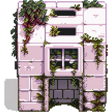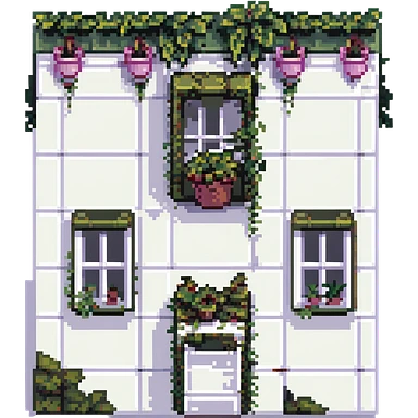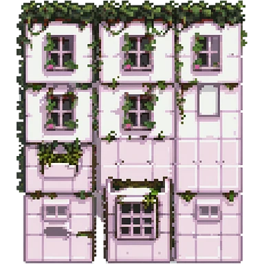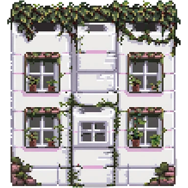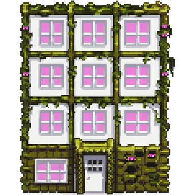 Сделай русскую панельку белого цвета. Она должна быть в виде куба, а также с окнами 3 на 3 на каждом фасаде. Панелька заросла лозой и мхом, некоторые окна розовые. Панелька должна быть в форме куба. emoji