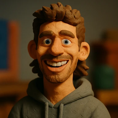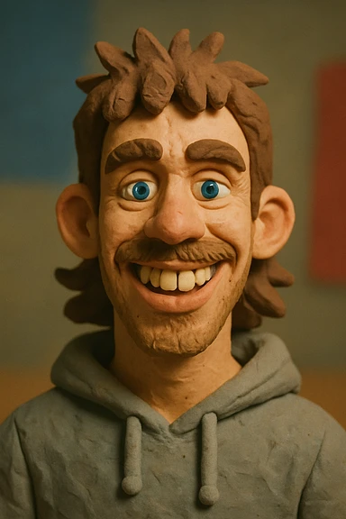 Claymation portrait of the user's face with a slightly larger forehead, friendly and confident facial expression, background in anthracite color. emoji