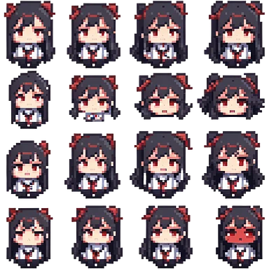 chibi-style Enma Ai from Jigoku Shoujo with red eyes, long black hair, sailor uniform, cute anime emoticon expressions and reaction faces, white background, high resolution, 4x5 grid emoji